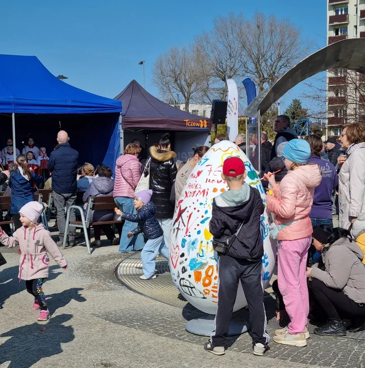Poza konkursem skwer żył kolejnymi punktami programu. Dzieci i dorośli zatrzymywali się przy dwóch ogromnych pisankach, które wspólnie malowano w ramach jednej z najbardziej widowiskowych atrakcji dnia. Swoje miejsce miały też zajęcia przygotowane przez Fabrykę Sztuk oraz Miejską Bibliotekę Publiczną – od warsztatów plastycznych po grę terenową, w której najmłodsi tworzyli świąteczne ozdoby.