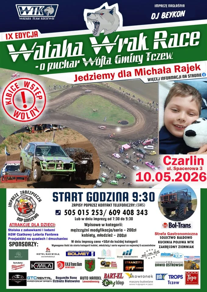 W Czarlinie znów zrobi się głośno, tłumnie i bardzo sercem na plus Już 10 maja 2026 roku wraca 9. edycja Wataha Wrak Race – o puchar Wójta Gminy Tczew, tym razem pod hasłem „Jedziemy dla Michała Rajek”. Będzie motoryzacyjnie, rodzinnie i charytatywnie, więc to jedna z tych imprez, które warto po prostu mieć na radarze i wpaść zobaczyć na żywo